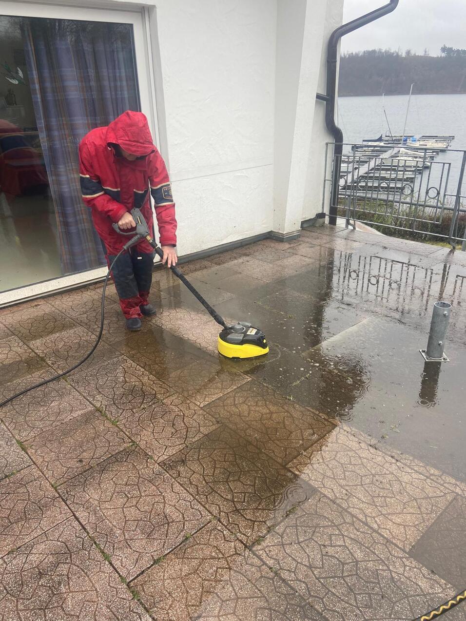 Doch damit nicht genug: die fünf Herren wollten dem Ganzen natürlich in nichts nachstehen. Also wurde die Terrasse kurzerhand zur Kampfzone erklärt. Bei nasskaltem Wetter – also genau dem Wetter, bei dem man normalerweise freiwillig auf dem Sofa bleibt – kam der Kärcher zum Einsatz. Mit vollem Einsatz wurde dem Winterdreck der Kampf angesagt.